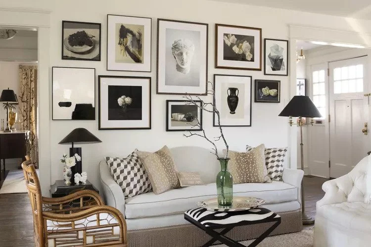 For every art installation, including gallery wall collections with multiple pieces such as family photos, various paintings, or beautiful antique plates, the 57” to 60” rule should be used, placing the center of the collection at that measurement.